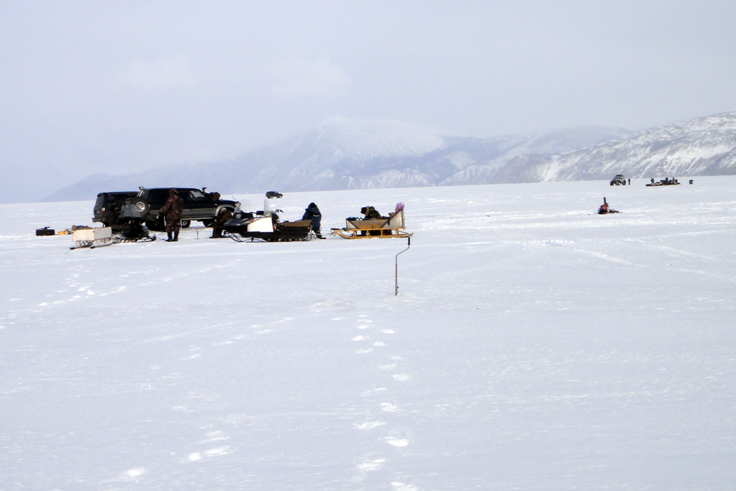 Только приехали с Мелководной, действительно дороги для авто нет и скорее всего уже не будет! Сейчас туда только на вездеходе или на снежике. Мы решили в этот раз ехать в ту сторону через Атарган, перевал штурмовали где-то с час, дальше шли уже по накатанной, в одном месте на Нурчане довануло воду провалились на метр. На бухте из авто только уазик, который кукует там с 15-го числа (я так думаю машину им прийдется кидать там, а домой на лыжах), трекол шестиколесный приезжал (ехал по нупам). В эти выходные рыба была более активная - вчера штук 250, сегодня 130 из них 1/3 навага, по вечерам крабили, за вечер по 10 крабов. Погода была ВАЩЕ - солнце, ветра нет, домой не хотелось ехать, но, завтра на работу! В следующие выходные наверное уже на Балаганное!