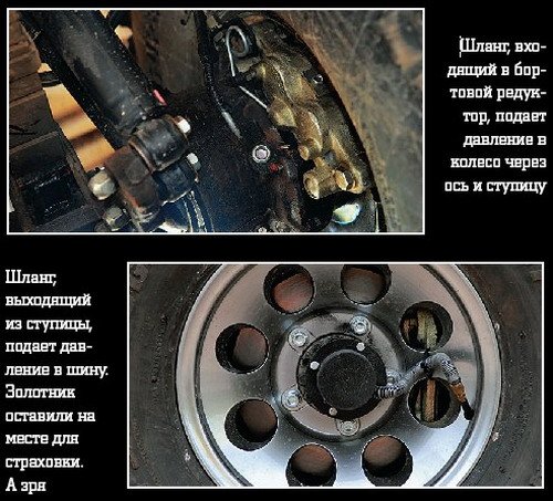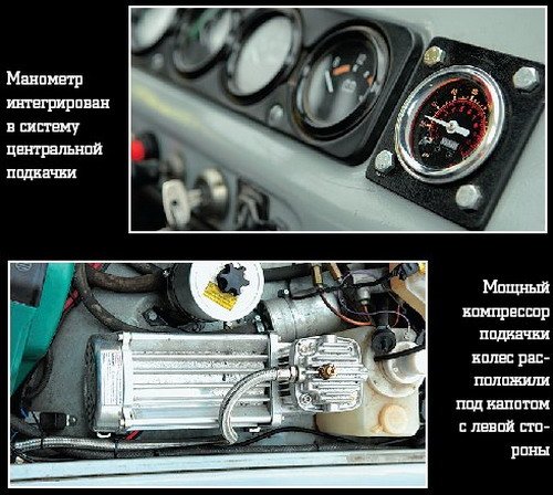 Автомобиль предполагалось использовать на дороге и бездорожье – не для спорта, но для охотничье-рыболовных забав. Такой развлекательно-оздоровительный вариант. Лифт подвески – проставки под кронштейнами серег рессор. Это грамотнее, чем длинные серьги, – управляемость здесь и так не очень, зачем ее дальше ухудшать. Лифт кузова на 100 мм реализован, естественно, с помощью проставок. Итог – колеса SuperSwamper Bogger диаметром 37 дюймов. Мосты портальные. Угол продольного наклона шкворня увеличили на 6 градусов, что прибавило курсовой устойчивости. Блокировки нижегородского производства довели до ума, добавив им работоспособности. Еще: силовой обвес, лебедки спереди и сзади, пол обработан противошумной изоляцией и закрыт рифленым алюминием – стандартный тюнинг «УАЗа». Расширители на два с четвертью дюйма. Шноркель вполне утилитарного вида и дизайна – прочный, дешевый, эффективный. Карбюраторный мотор заменили современным инжекторным, ульяновского же производства. Добавили отопитель задней части салона и подогрев сидений. Очень удобен люк от автобуса «ПАЗ» – можно приоткрыть для проветривания, можно откинуть для стрельбы или фотосъемки. Бортик по краю не даст затечь воде. Cамое же главное – автоматическая подкачка колес, новая разработка фирмы. Справа от остальных приборов поселился манометр, а спереди перед рычагами КПП и РК – краники. Можно, не выходя из салона, замерить давление в любом из колес, подкачать их – каждое в отдельности или все сразу. Еще одна важная мера для повышения проходимости – увеличенное с 1.98 до 2.98 понижение в раздаточной коробке. НЕ СПАСАЕТ ПОНИЖЕНИЕ Стоит ли удивляться, что мне нетерпелось опробовать этот замечательный аппарат. Мы выдвинулись на нем в сторону небольшого прудика невдалеке от мастерских. Сдвоенные амортизаторы заставили работать подвеску, машина не прыгала! Затем нам путь преградили бетонный блок и вбитые штыри. Так, слегка приспустив шинки, пытаемся перелезть через блок с краешку. Не выходит! И увеличенное понижение в РК не спасает – не едет на низах даже инжекторный «УАЗ». Пришлось газануть. Четыре Bogger’а, провернувшись, выплюнули по кубометру грунта. «Уазик» двинулся на полметра вниз. И сел на порог. Приехали... Зато в грязи и колее на нем будет хорошо, если ехать немного ходом. В общем, приятно удивил меня «УАЗ». |