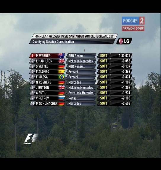 Pos No Driver Team Time/Retired Gap Laps 1 1 Sebastian Vettel RBR-Renault 1:30.916 15 2 2 Mark Webber RBR-Renault 1:31.049 0.133 16 3 5 Fernando Alonso Ferrari 1:31.138 0.222 12 4 3 Lewis Hamilton McLaren-Mercedes 1:31.578 0.662 13 5 4 Jenson Button McLaren-Mercedes 1:31.623 0.707 14 6 8 Nico Rosberg Mercedes 1:31.694 0.778 19 7 6 Felipe Massa Ferrari 1:32.144 1.228 13 8 14 Adrian Sutil Force India-Mercedes 1:32.391 1.475 20 9 7 Michael Schumacher Mercedes 1:32.523 1.607 16 10 12 Pastor Maldonado Williams-Cosworth 1:32.751 1.835 18 11 10 Vitaly Petrov Renault 1:32.777 1.861 18 12 15 Paul di Resta Force India-Mercedes 1:32.813 1.897 21 13 9 Nick Heidfeld Renault 1:33.072 2.156 18 14 11 Rubens Barrichello Williams-Cosworth 1:33.179 2.263 17 15 17 Sergio Perez Sauber-Ferrari 1:33.531 2.615 20 16 16 Kamui Kobayashi Sauber-Ferrari 1:33.671 2.755 20 17 18 Sebastien Buemi STR-Ferrari 1:33.948 3.032 21 18 19 Jaime Alguersuari STR-Ferrari 1:34.125 3.209 19 19 20 Heikki Kovalainen Lotus-Renault 1:35.385 4.469 13 20 24 Timo Glock Virgin-Cosworth 1:36.724 5.808 21 21 23 Vitantonio Liuzzi HRT-Cosworth 1:36.804 5.888 23 22 25 Jerome d'Ambrosio Virgin-Cosworth 1:36.894 5.978 23 23 21 Karun Chandhok Lotus-Renault 1:36.959 6.043 18 24 22 Daniel Ricciardo HRT-Cosworth 1:37.554 6.638 22 -------------------- (964) 459-792-девять Дмитрий, адвокат
