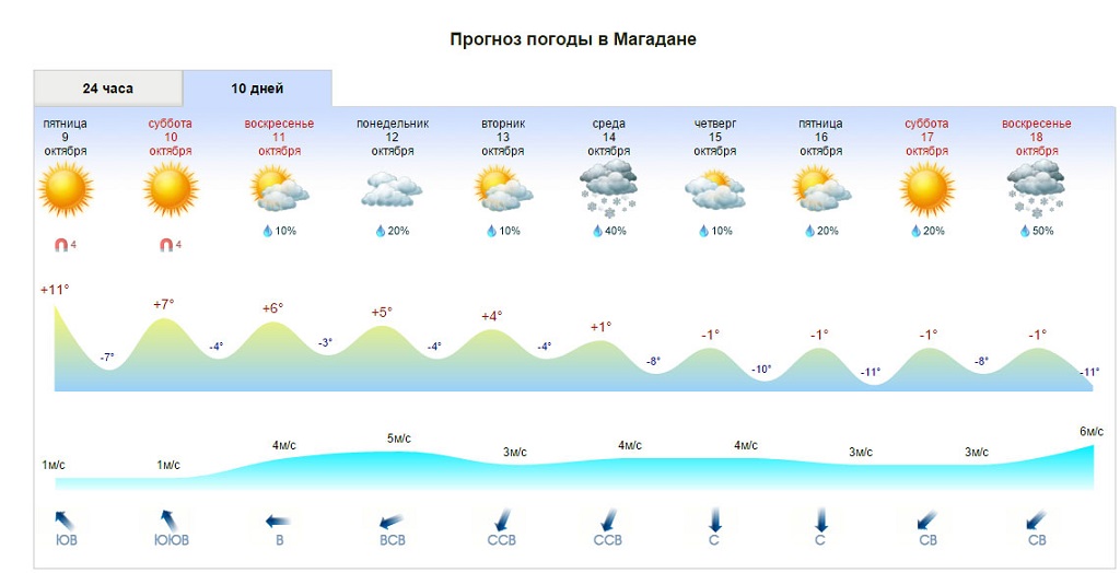 10 октября. Небольшая облачность, без осадков, ветер северо-восточный 5-10 м/с, температура ночью 0,+2 гр, днем +6,+8 гр. 11 октября. Переменная облачность, без осадков, ветер северо-восточный ночью 6-11 м/с, днем 9-14 м/с, температура ночью 0,+2 гр, днем +5,+7 гр. 12 октября. Облачно с прояснениями, временами небольшой дождь со снегом, ветер северо-восточный 12-17 м/с, температура ночью около 0 гр, днем +4,+6 гр. -------------------- Политики – словно подгузники. Их надо почаще менять. И по той же причине.