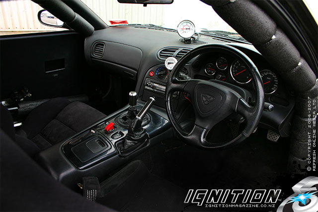 Шейн, механик по профессии, специализируется на роторных двигателях, занимаясь созданием монстроподобных роторов для своих клиентов. Так что когда дело коснулось выбора собственного средства передвижения, он пал на RX-7, и это совсем не удивительно. Окончательно все встает на свои места, когда узнаешь, что Шейн является ярым поклонником трековых состязаний, ну а поскольку «Бэт-мобили» RX шестой серии и выше известны своим низким центром тяжести и непревзойденным для заднего привода сцеплением с дорогой, они являются идеальным вариантом для отжига на гоночном треке. Учитывая все это, Шейн практически не колебался и быстро приобрел для себя относительно нетронутый экземпляр Mazda RX-7. Но в таком нетронутом виде авто просуществовало очень недолго. Шейн, учитывая специфику избранной профессии, имеет массу возможностей построить интересный аппарат, и раз уж он собрался делать для себя игрушку, энтузиазм его безграничен. Практически сразу Шейн собственноручно вытащил из RX-7 двигатель, 13В, разобрал его и отстроил заново, установив дополнительное оборудование, добавляющее резвости. Балансировка вращающих компонентов 6 серии обеспечивает гармоничное сгорание, а также, что более важно, обеспечивает более надежную работу двигателя, известного своим непостоянством. Камера тоже не избежала вмешательства: диаметр выпускного канала сильно расширили, обеспечив более чем щедрый отвод отработанных газов в массивную турбину Т04Z. Изготовленный на заказ впускной коллектор Proform позволил разместить турбину вместе с вейстгейтом Trust на блоке. Зажигание налажено, отработанные газы уходят из блока через 3-дюймовый выпуск, а сжатый воздух поступает непосредственно в интеркулер RWR Barrel водно-воздушного типа охлаждения. Он дополнительно охлаждает горячий воздух, прежде чем тот попадет в двигатель. Интеркулер такого типа хоть и весит несколько больше обычного за счет радиатора и бачка для воды, но имеет ряд преимуществ: в отличие от интеркулеров, охлаждаемых только воздухом, он обеспечивает постоянное снижение температуры при отсутствии задержки в охлаждении, с которой сталкиваются обладатели воздушных интекулеров. Роторные двигатели известны своим и без того нескромным аппетитом, ну а обладатель таких вызывающих пропорций и подавно будет очень требовательным в плане питания. Проблему решили при помощи установки топливного насоса SX, который качает горючее из штатного и дополнительного бензобаков. Завершают картину форсунки на 1 600 куб. см и дополнительные на 550 кубиков. Контролировать весь процесс было поручено более чем компетентному в этом вопросе блоку Haltech E6k, который после небольшого вмешательства мастеров из Japanese performance настроили на внушительные 462 л.с. при давлении 1,17 Бара. Напоминаю, настройка производилась с учетом использования машины на гоночном треке, а значит потенциал у нее намного больше, стоит Шейну лишь захотеть… Но все это поголовье под капотом будет совершенно бессмысленным без надлежащей подвески и трансмиссии. Прекрасно зная об этом аспекте, Шейн снабдил свою RX множеством отличных деталей, включая сверхлегкий маховик Night Sport (3,17 кг) и двухдисковое сцепление. Благодаря этим деталям новая коробка OS Giken не проскальзывает, и вся мощь двигателя без потерь передается на дифференциал повышенного трения Mazdaspeed 2 Way. Подобная комплек
