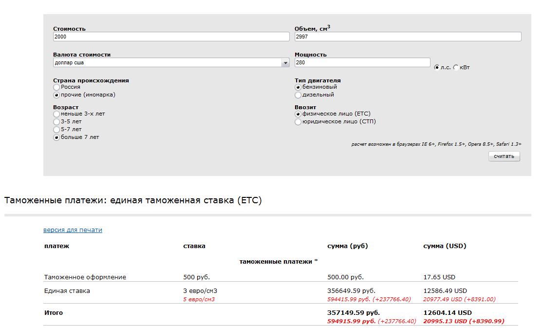 Афигеть. Вот стоймость таможки на фашку=) Собственно год без разницы 300тка выпускалась тока до 99 года, так что все равно старше 7 лет. Ну и я считал среднепродажную ценув японии 2000 долларов, хотя у них бывают стартовые цены и от 500 у.е., один фиг они по 500 уюею не продаются даже с оценкой 3... ибо встречаются экземпляры у которых оценка 3 и стартовая цена 3000 у.е.=) Ну кто знает о чем я тот поймет. Собствено цена в 500 или 3000 у.е. уже роли не играет. 20 000 у.е. тока таможня! мать моя. теперь только "маруся"... -------------------- наружная реклама, световые буквы, подсветка зданий
