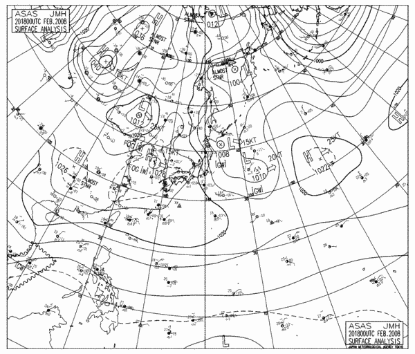 Вот ссылка доступна только зарегистрированным находятся хорошие текущие карты погоды от Japan Meteorological Agency. Там же есть 24 и 48-часовые прогнозы, которые не всегда точны, но зачастую по ним можно делать хоть какие-то выводы. Карты читать несложно: L - циклон, H - антициклон, каждая линия показывает изменение давления (не помню на сколько). Нормальное давление 1013 мбар, изменение на 30 мбар это много, 50 очень много, а 70 просто жопа. Циклоны и антициклоны движутся на восток с разной скоростью, сам циклон крутится против часовой стрелки. Антициклон - по часовой. Стрелочки возле L показывают направления движения, полосочки - направление ветра, а перышки на них - силу ветра.