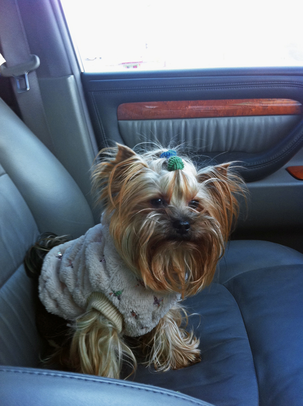 Лучшая половинка, может придумать что-то типа короткого поводка с карабином на краю, который будет всегда в машине. Если собачка на переднем сиденье катается, то просунуть этот короткий поводочек между спинкой и местом на котором сидят, собачке тесно не будет, но в то же время ни кому мешать не будет, да и вобще куча мест в машине к которым можно приспособить этот поводок чтоб вем было хорошо