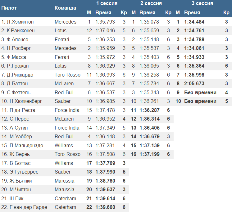 Странную тактику для Грожана выбрали в Лотусе - всего одну попытку во втором сегменте. Рассчитывали, что одного круга будет достаточно? Любопытно, что завтра Масса покажет. Хюлькенберг, наверное, все локти сгрыз, глядя на Форс Индию.