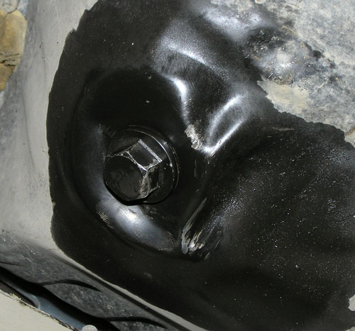 Вчера ездил со своей бабушкой на огород. Когда возвращались обратно, на проселочной дороге на спуске машину раскачало аккуратно в том месте, где на некотором расстоянии друг от друга растут из земли два валуна, и ни один валун я не пропустил - машина тюкнулась по разу о каждый. Сегодня вечером, будучи дома, выглядываю в окошко и замечаю под машиной темную лужицу. Тут же мне звонит никА и тоже сообщает об увиденном. Ладно, посуетившись, я собрал вокруг себя группу поддержки из коллег. Масло на щупе находилось едва-едва выше минимальной отметки. Посовещавшись, мы построили план. Прикупив две литровки масла и холодную сварку, я с одним товарищем поехал в автобусный парк, где, по его словам, "царит коммунизм", и поэтому имеется свободный доступ к эстакаде. При осмотре поддона оказалась, что течь идет из-под пробки (болта). Про деформацию металла в месте расположения пробки я умолчу, на картинке видно. Подкрутил пробку - течь прекратилась. Пока всё, можно считать, что отделался лёгким испугом. Утром посмотрю как будет.