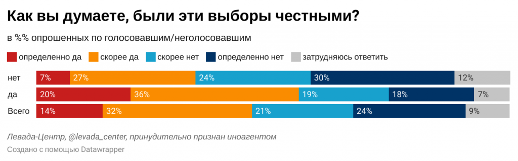 Нажмите для просмотра прикрепленного файлаРоссияне, принявшие участие в голосовании, с большим доверием относятся к результатам выборов – среди них 56% считают, что выборы были честными, 37% – что нечестными. Среди тех, кто не голосовал: 34% и 54% соответственно.