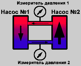 На вход первого насоса должно поступать больше масла, чем нагнетается вторым насосом. Измеритель давления 1 показывает пониженное давление (трубка закрашена синим цветом).