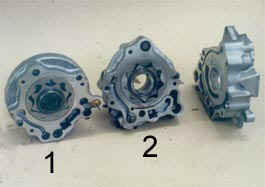 Первые два "слоя" повернуты на 90 градусов. Виден передний (1) и задний (2) масляные насосы.