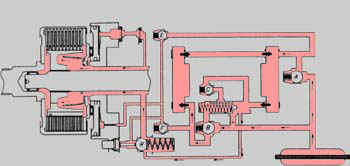 Представьте, что насос номер 1 приводится во вращение передней осью автомобиля, а насос номер 2 - задней осью. При движении по прямой с постоянной скоростью по асфальтированной дороге, оба насоса вращаются с равными скоростями. В гидравлической схеме отсутствуют области пониженного или повышенного давления. Если передние колеса начинаю буксовать (например на льду), передняя ось начинает вращаться быстрее чем задняя и производительность 1-го насоса становится больше чем производительность 2-го насоса. Установив многодисковое сцепление, подобное изученному ранее, в механизме привода задних колес автомобиля и организовав подачу к нему масла из области с повышенным давлением, можно обеспечить передачу мощности (от двигателя или передней оси) к задним колесам, т.е. автомобиль станет полноприводным.