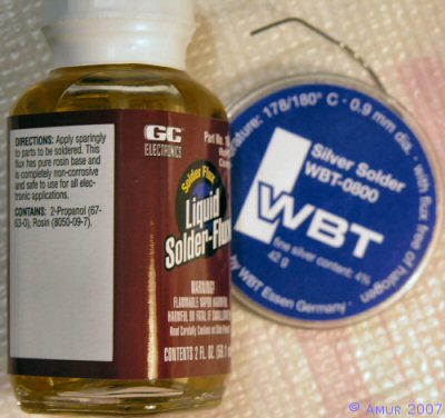 Для пайки разъемов я использовал безсвинцовый серебросодержащий припой WBT-0800, температура плавления которого составляет 178-180 гр. С, что гарантирует минимальный нагрев контактов разъема при пайке. В качестве флюса использован безкоррозийный жидкий флюс. Он является раствором очищенной канифоли в пропаноловом спирте (этиловый спирт неизбежно содержит в своем составе определенный процент воды, что является причиной коррозии).