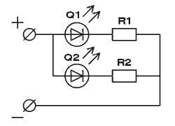 На рисунке Q1 и Q2 - светодиоды, R1 и R2 - резисторы. При таком подключении на каждый СИД приходится паять свое сопротивление. Это самый надежный и безопасный вариант, но требует больше инсталляционной работы и больше резисторов.