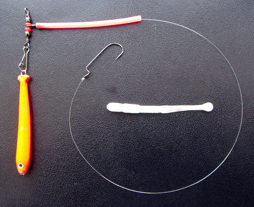 Поводок, длиной примерно 20 см, вяжется на трехсторонний вертлюжок. Поводок лучше из флюорокарбона.