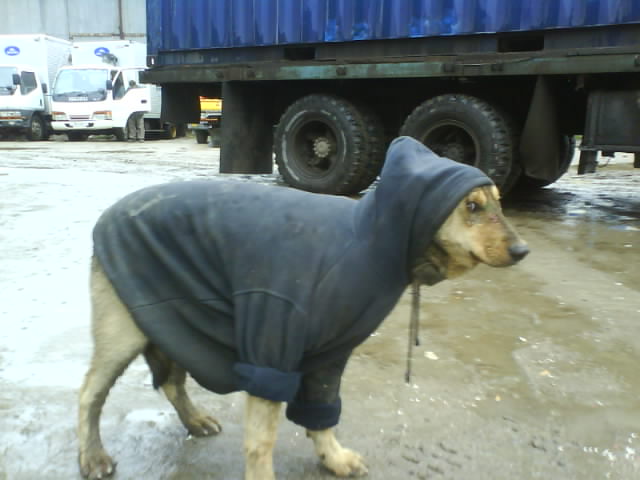 собака истощенна (кожа, да кости), промёрзла и безумно добрая. за ребёнком ходит хвостом,