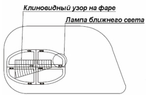 Установка светокорректора на "водительскую" фару: Встаньте лицом к "водительской" фаре. Расположите светокорректор строго над клиновидным узором на фаре (покрывая его), расположенном слева-снизу от лампы ближнего света, так как показано на рисунке. Если клиновидный узор на фаре не просматривается, то расположите светокорректор снизу-слева от лампы ближнего света