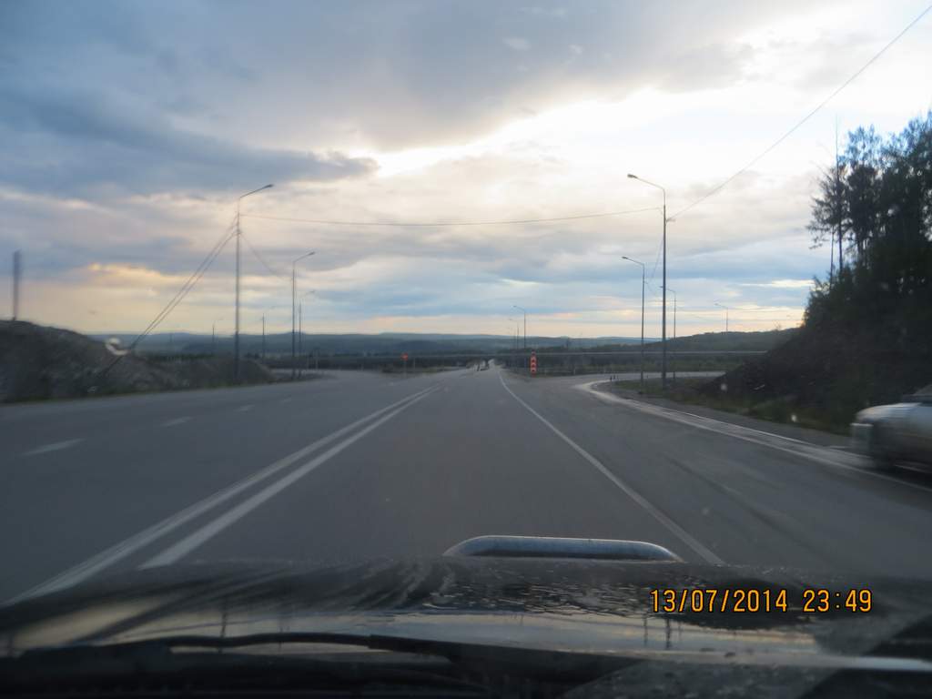 Проехали, оставив в стороне ст. Зима. Проезжая Тулун, занервничали. После реконструируемого моста на регулируемом светофоре пофигатор предложил нам повернуть налево, в центр (согласно указателю), а информационный знак указывал, что нам надо двигаться прямо. Так как я в это время с докладом о путешествии звонил Lev_43, в точности данных информационных знаков уверен не был. Лена протянув по разбомбленному реконструируемому объезду, забастовала. После пылкого спора, вернулись к мосту. Пока спорили, куда ехать, слышал гудок, оглядев плотную процессию машин на мосту номеров 49 региона не увидел. Судя по последовавшей переписке на форуме, нам фафакали Голландцы. Проползли мост в обратку, развернулись, опять поползли по уже пройденному пути до знака. Убедившись, что я оказался прав, я ещё раз возмущенно посотрясал воздух