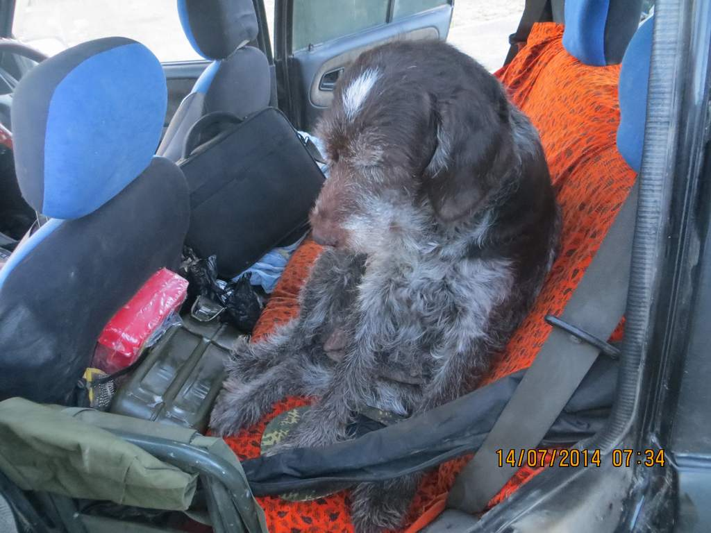 Нажмите для просмотра прикрепленного файлаПлотно позавтракали за Тангой на 221км в кафе «Светлана» (в этих краях кафешки встречались чаще, появился их выбор). Кафе вполне даже ничего – вкусно, недорого (на двоих бифштекс и гуляш с пюре, кофе, итого на 272р), правда порции небольшие, можно было ещё чего заказать (ну, проглот я! Проще пристрелить, чем прокормить). Позже остановились размяться и попить чайку, собачке дать побегать. Собаке очень понравилась степь – бегает челноками, как и положено настоящей легавой, вынюхивая всякую пернатую мелочь (её там полно), еле загнали эту охотницу в машину.