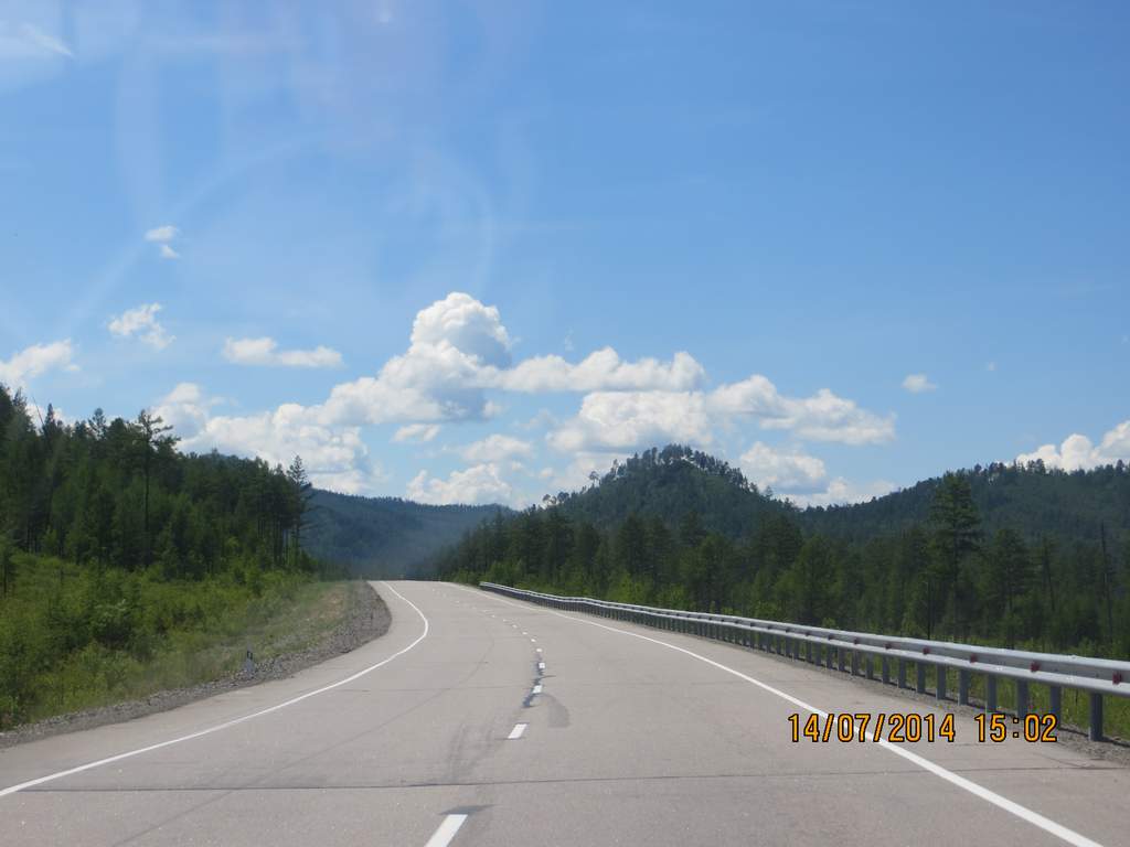 Перевалив Байкальский перевал (так он вроде называется), перестроились согласно указателю у Шелехова на новую вставочную трассу до Московского тракта (так его называет навигатор). Тут уже пошло достаточно напряженное движение, много встречек. Нам буквально минут за пять через двойную сплошную три раза подряд в лоб заходили встречки, обгоняя фуры и других тихоходов, заставляя нас жаться к обочине. Быстро сообразили, что тут так принято ездить – полосы всего 2 и они широкие, дорога позволяет свободно идти 110 и больше, при плотном трафике народ приучился ехать не посредине своей полосы, а прижимаясь к краю дороги, оставляя место для обгоняющих. Долго не могли привыкнуть к средней скорости 110, непривычно для нас. Потом втянулись, даже начали обгонять на иркутский манер фуры, миллиметруя между обгоняемым и встречками.