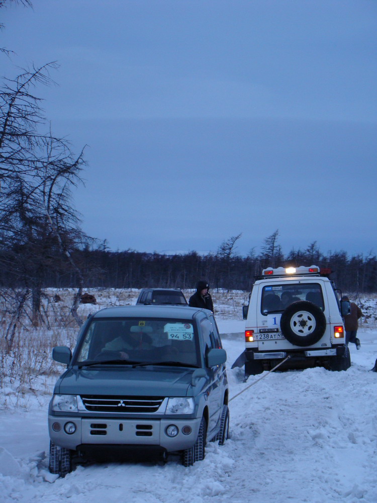 Дальше проехали ещё с пару километров... Смалкин, обладающим наименее подготовленным автомобилем из всех подседает в снегу, приходиться обращаться к помощи ЭСКУДО.