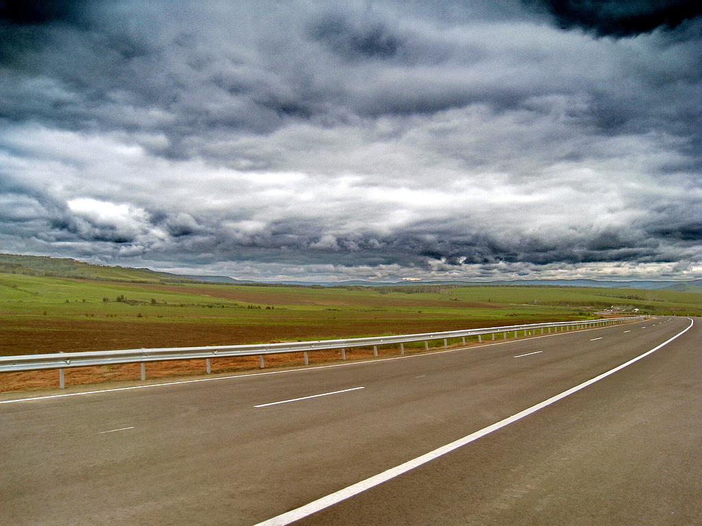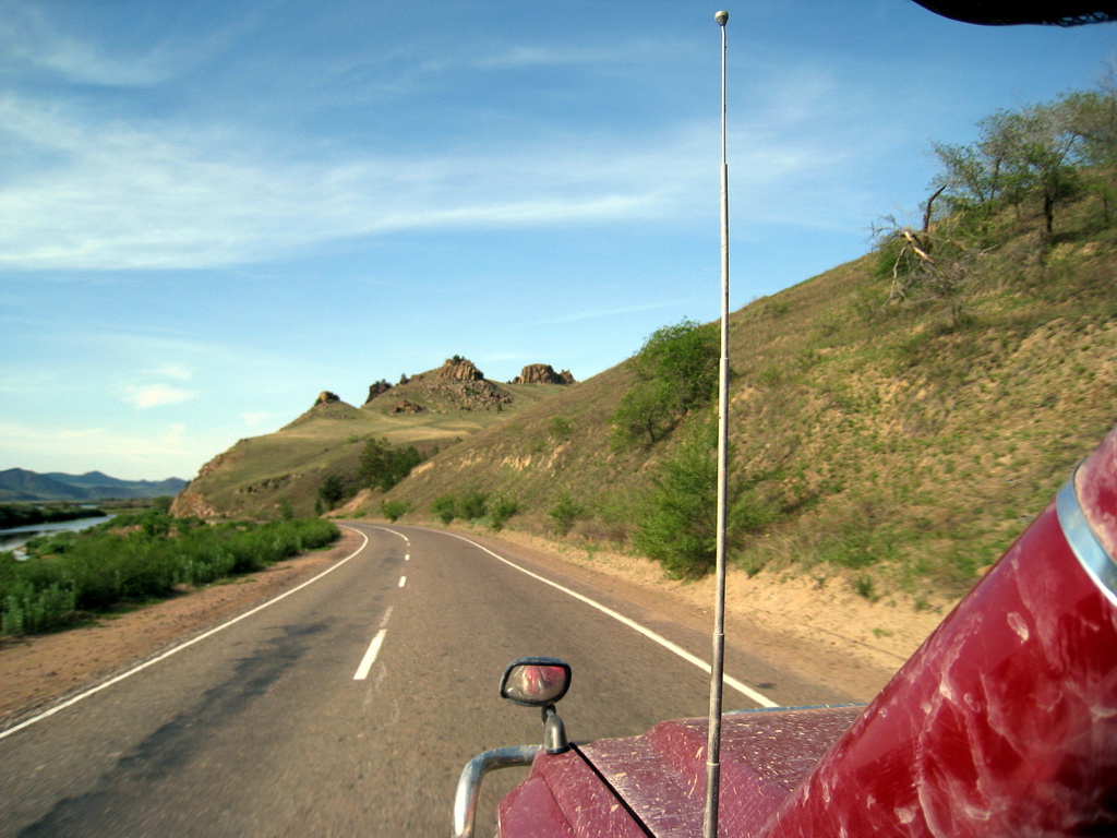 Фото дороги практически нет, потому как штурман опять нагло начал дрыхнуть. Сама трасса начала поднимтаься в горы, вокруг кедровый лес, по обочиная таблички – «Осторожно! В лесу – клещ! Убьет». Решили, что имеет смысл – не останавливаться, и тем более в лес не ходить.
