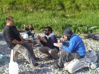 в первый день приезжаем, на повороте на лагерь ночевка, костер, разговоры.