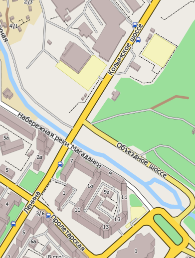 проспект Ленина начинается от перекрестка с Набережной реки Магаданки (хотя и должен бы от Автовокзала или Главпочтамта по-честному).