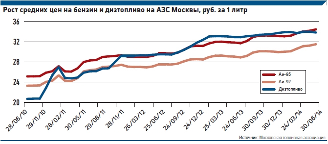 Средняя по Москве стоимость АИ-95 выросла на 11 коп., до 34,44 руб. за 1 л, АИ-92 — на 12 коп., до 31,5 руб. «Думаю, что в ближайшее время за ЛУКОЙЛом и «Транс-АЗС» последуют другие владельцы АЗС и поднимут цены, считает президент МТА Евгений Аркуша. С ним согласен директор по развитию бизнеса агентства «Аналитика товарных рынков» Михаил Турукалов.