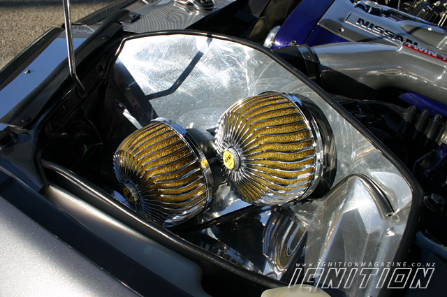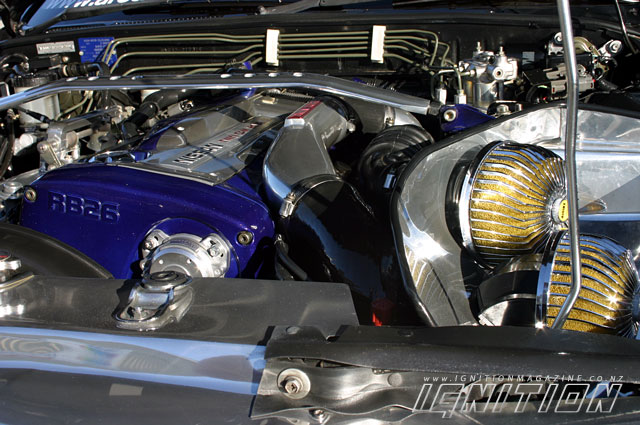 Изменения в подкапотном пространстве носят скорее умеренный, нежели безумный характер, поскольку дело касается GT-R. При внешнем осмотре виден лишь небольшой радиатор, выступающий из-под переднего бампера. Хотя на самом деле это не радиатор, а реально большой интеркулер — 610 х 237 х 136 мм, Apexi GT Spec, разработанный специально для GT-R.