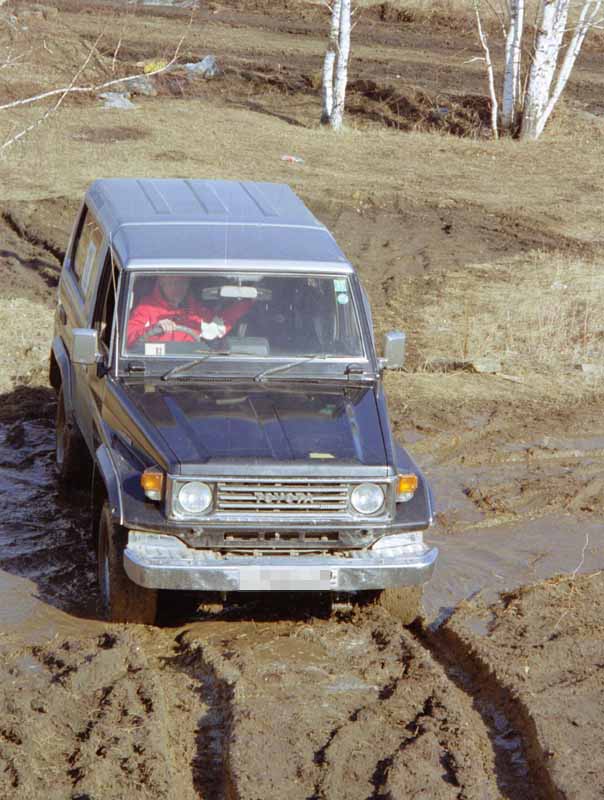 А еще в грязях и снегах весьма остро стоит «резиновый» вопрос. В этом мы лишний раз убедились в той самой «песочнице», где за месяц до того проходил джип-триал. Раскисшее за четыре недели некое подобие дорог совсем не захотело принимать покрышки Falken размерности 265/75R15 со слегка истертым протектором. И хотя в грязевые ванны Hunter окунался с удовольствием, но подъем, на который во время триала забирался без проблем, не взял. Чуть-чуть ему не хватило до верха — задергался, забился в конвульсиях и скатился вниз. Лишь водитель отрицательно махнул головой. Так что «резина» всему голова.