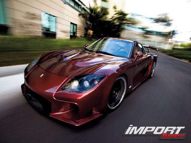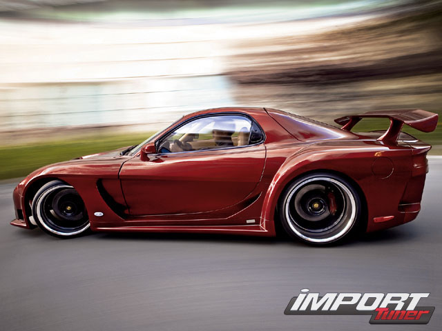 Установка комплекта обвеса из стекловолокна была трудной задачей, с которой с честью справились ребята из DTM Autobody в Эль-Монте, Калифорния. На все про все у них ушло пять долгих месяцев. Наконец, Мазда гордо явила всем новый шикарный расширяющий обвес винного цвета. Последним штрихом в деле выделения на фоне других RX-7 стала отделка салона кожей цвета Ferrari biscuit (светло-бежевая) с красной строчкой, гармонирующей с цветом карбонового торпедо.