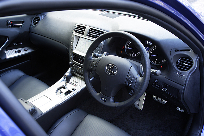 Попробуйте затем сесть в салон и осмотреться, и я уверен, что ваше впечатление не изменится. Обратите, хотя бы, внимание на рулевое колесо. Оно отделано натуральной кожей специальной выделки со своего рода ячейками (чтобы руки не скользили). Это надо же додуматься до такой, казалось бы, мелочи! Передние сидения сделаны с хорошей боковой поддержкой, поэтому, садясь, можно не сомневаться — в таком кресле ерзать не придется, даже если саму машину будет бросать из стороны в сторону. И еще: многим не понравилось, что в салоне базового IS место водителя приподнято. Так вот, спешу обрадовать: в салоне IS F сидение опущено на 10 мм, так что лично мне такая высота пришлась в самый раз.