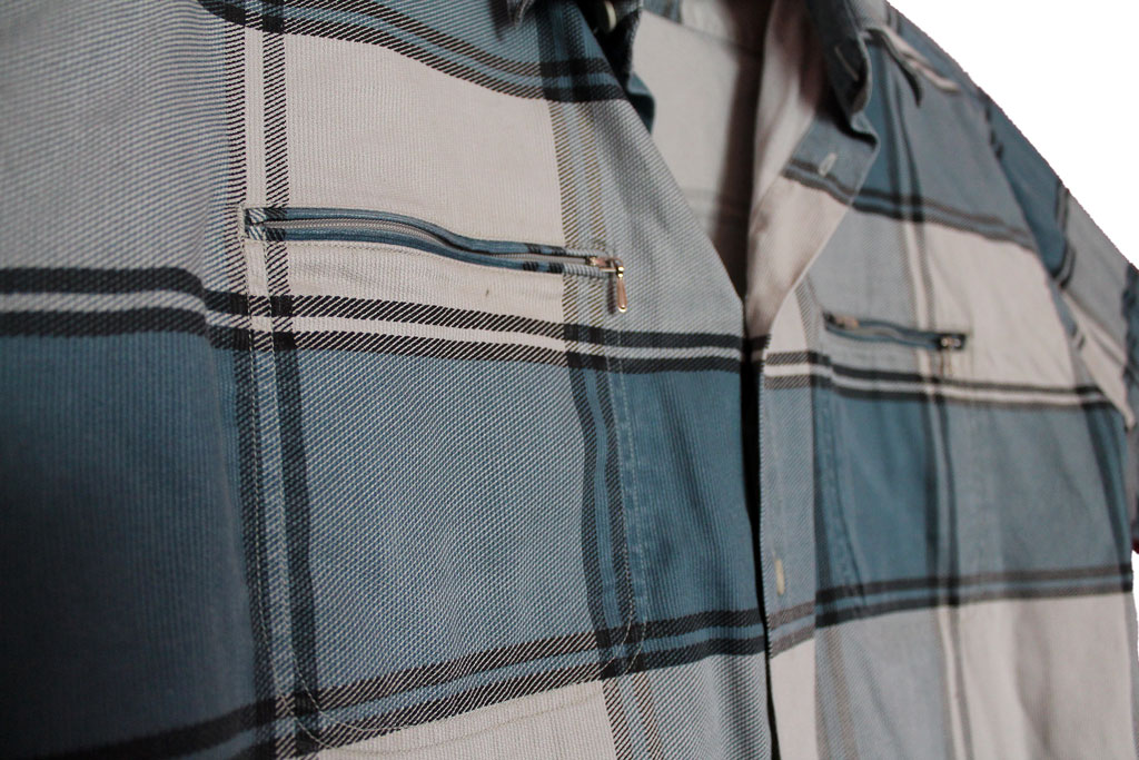 Плотная, 100% хлопок, на груди два кармана на молнии (не обманка), дополнительная пуговица на рукаве.