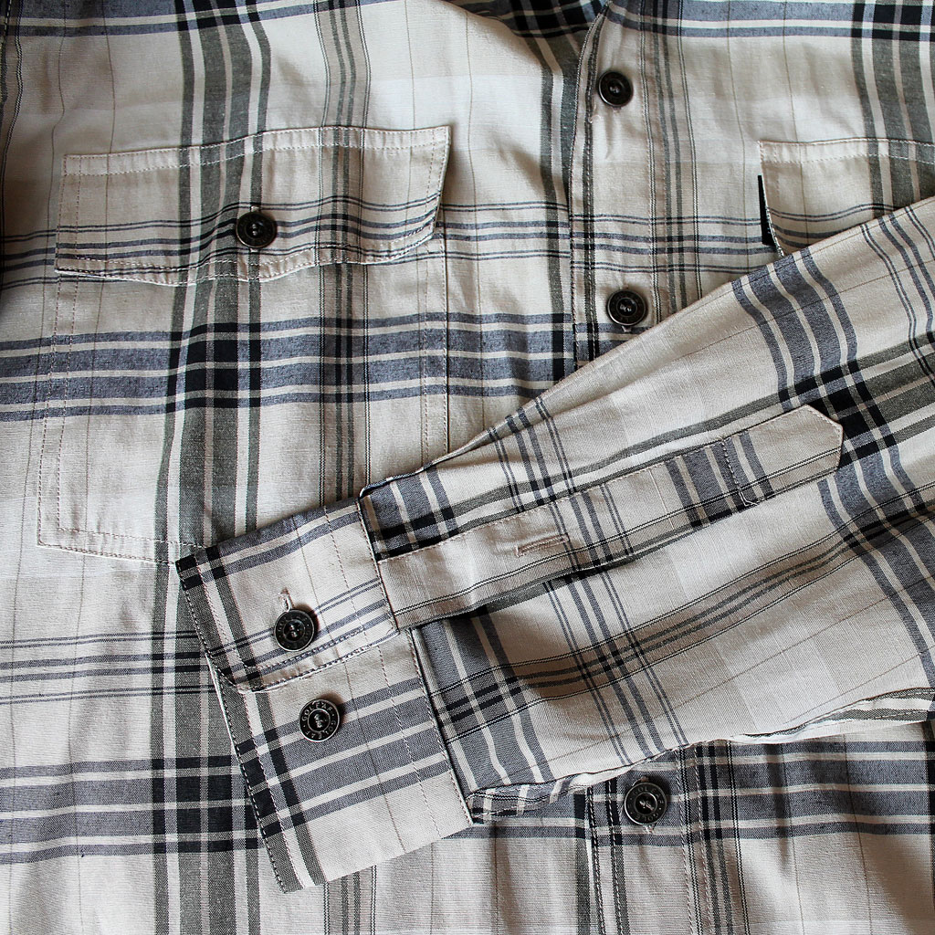 Плотная, 100% хлопок, металлические заклёпки, на груди два кармана на обычных пуговицах, дополнительная заклёпка на рукаве.