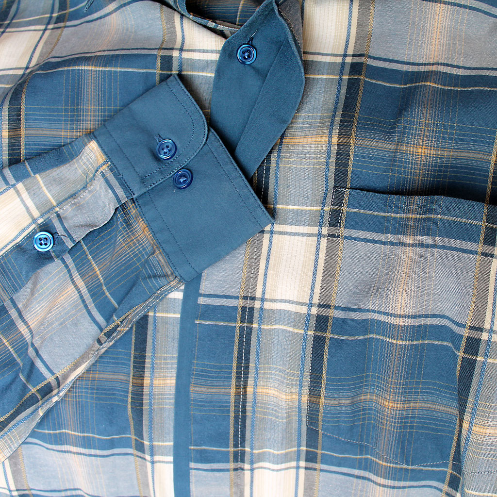 Лёгкая, 20% полиэстер, 80% хлопок, на груди один карман слева, дополнительная пуговица на рукаве, скрытые пуговицы.