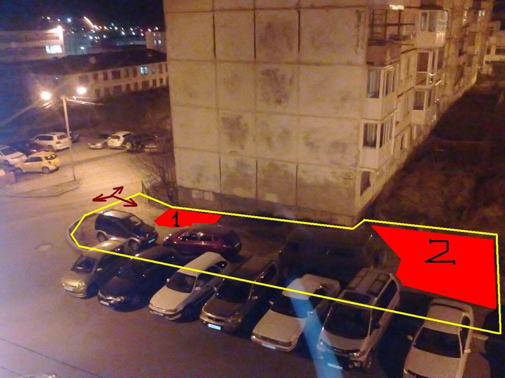 И я хочу попросить каждого, кому не лень, написать в ответном посте в какую зону желтого участка он припаркуется на ночь, при расстановке авто как на фото.