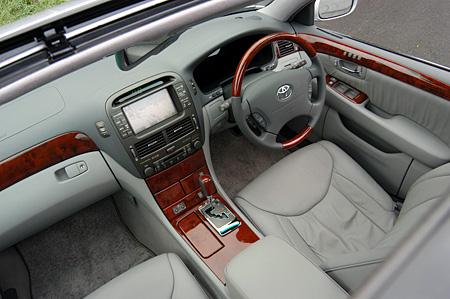 Дизайн приборной панели и внутреннего оборудования ортодоксален, без каких-либо особенностей. Если Celsior – все-таки флагман Toyota, то в этом направлении хотелось бы более «наступательной» позиции. Качество деревянных панелей высокое, но ощущения высокого качества от центральной панели, отделанной металлом, и от волнистой поверхности кожи сверху, все же немного недостает. Шкалы приборов на панели оптитронного типа хорошо видны, однако переключатели разбросаны в разных местах, часть из них скрыта рулём и не заметна. Надписи на переключателях выполнены и на японском языке, и на английском, что также создаёт диссонанс. Лучше было бы, если бы сосредоточились только на одном из языков.