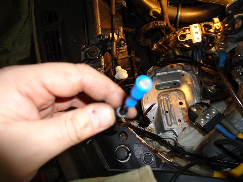 "рвем" черный минус (на схеме "F")что идет на лампочку с водительской стороны, на всякий случай делаем клеммы, чтобы можно было ежели что восстановить цепь, важный момент, если минус не разорвать то будет КЗ, при включении ДХО.