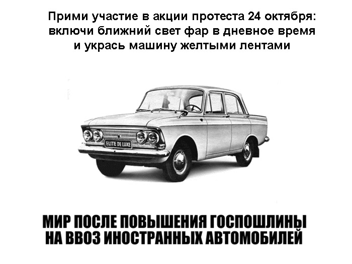 Между тем активисты готовятся к акции протеста, объявленной Федерацией автовладельцев России (ФАР) на 24 октября. В рамках акции уже 47 000 человек подписались под обращением к президенту Д.Медведеву.