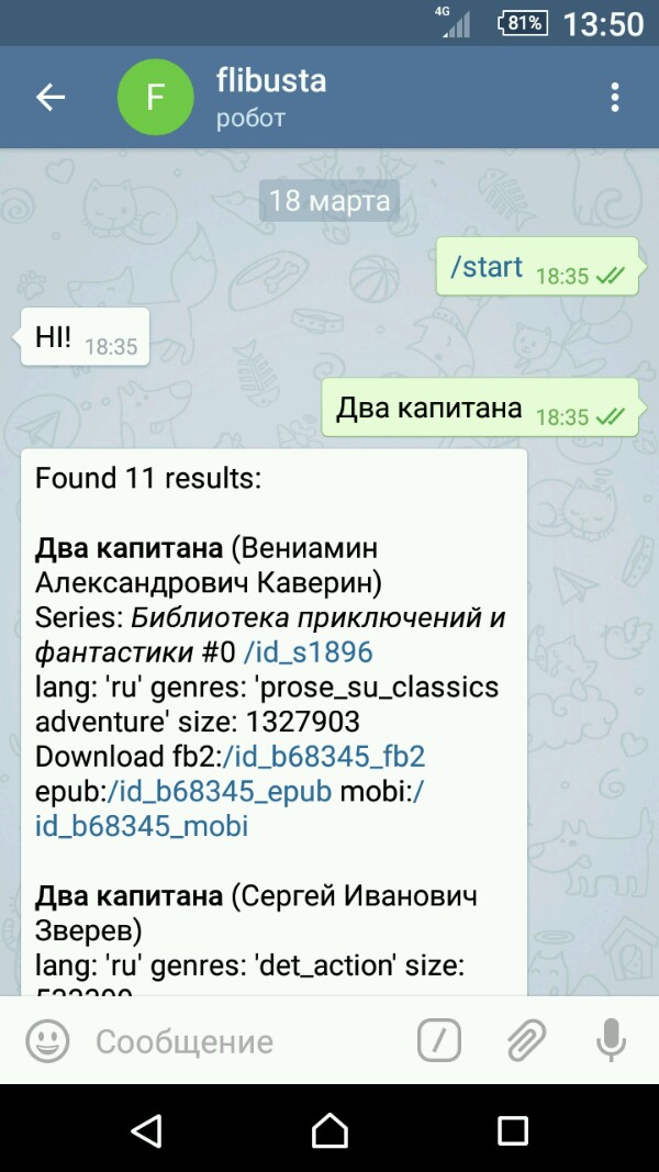 Работает все очень просто. Сначала надо добавить бота @flibustamirrorbot. Для этого просто найдите его в поиске Telegram. После нажмите кнопку Start и пользуйтесь сообщениями как поиском. Вводите имя автора или название книги – бот в ответ предлагает варианты поиска. Выбираете нужную книгу, нужный формат – и, опять же, в ответном сообщении приходит файл с книгой. Сервис предлагает скачать книги в форматах fb2, epub и mobi.