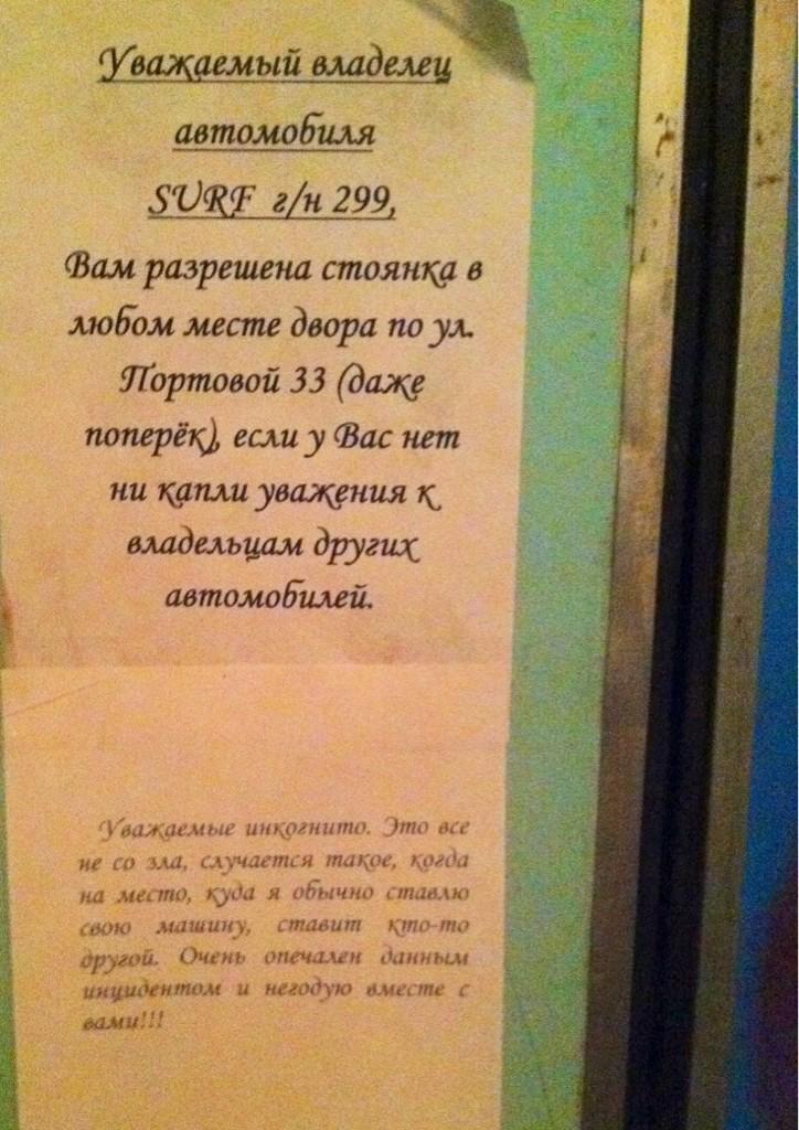 У нас во дворе кладут асфальт (Карла Маркса 65-а/б/в), на обеде поставила машину на парковку у здания "Скала Надежды", что за Северным сиянием. Прихожу вечером, на лобовухе записка " Уважаемый водитель! Обратите внимание, что данное место относится к стоянке автомобиля Т 116 АН. Просьба в дальнейшем не оставлять свою машину здесь на столь длительное время. С уважением, администрация МРО ЦХВЕ "Скала Надежды"))))))))))))Поднимаю глаза-на ограждении табличка: "Стоянка автомобиля Т 116 АН"))) Че к чему?)) На работе сейчас посмотрела-данная территория именуется как проектируемая улично-дорожная сеть и является землями общего пользования..жесть, вот народ гонит, даже табличку не полинились повесить))))