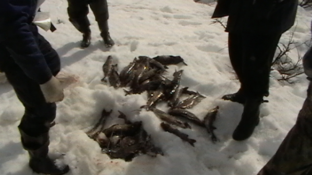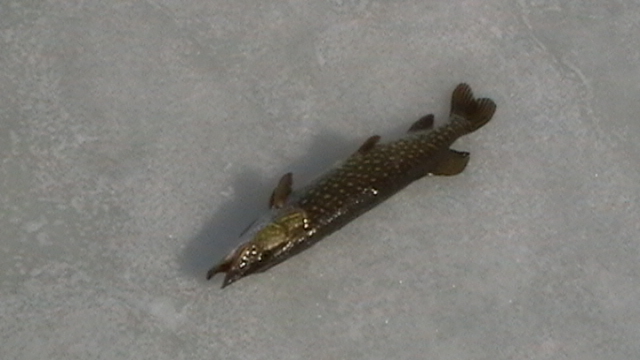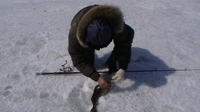 Остановились в начале Порапольского дола, просверлили лунки, лёд почемуто был не толстый всего полтора метра, немного посидели клёва небыло (ловили на блесну) мужики уехали искать клёвые места а я остался на этом месте, как только они уехали тут всё и началось