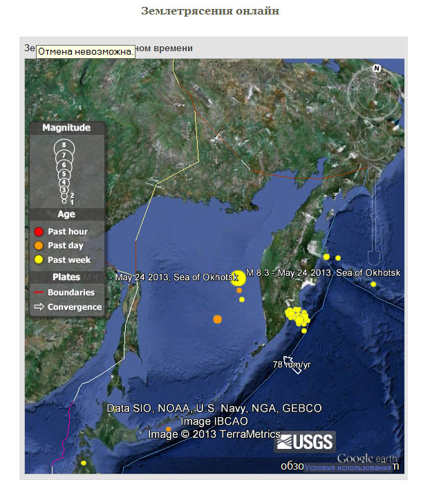 http://www.mchs.gov.ru/news/item/420248/"В 09.47 (мск) 24.05.2013 г. в акватории Охотского моря (358 км восточнее Петропавловска-Камчатского) зарегистрировано землетрясение магнитудой 6,9 на глубине 600 км. Незначительные толчки ощущались в ряде регионов Российской Федерации.