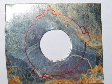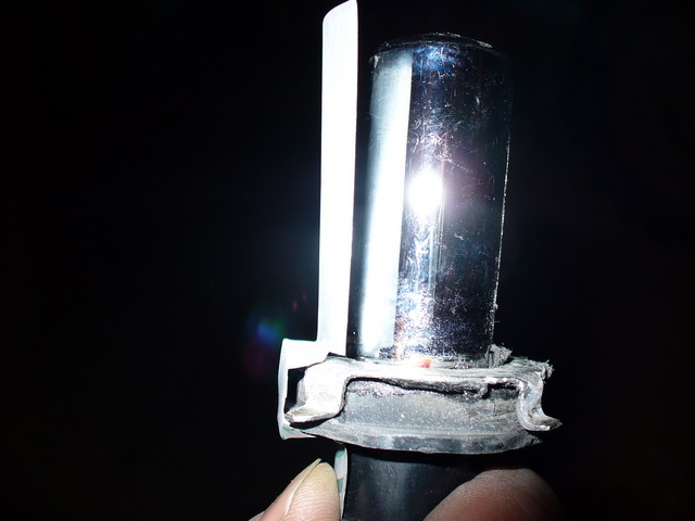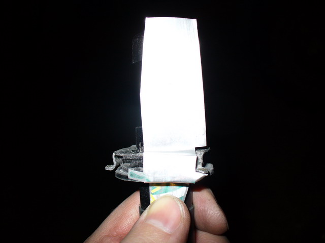 Обрезаем жесть по получившемуся контуру. Затем делаем разрез между примыкающими друг к другу усиками. Надеваем накладку на заднюю часть цоколя лампочки и подгоняем внешнюю форму кольца и усиков. Далее, расширяем центральное отверстие в кольце, примерно так, как показано на фото, чтобы фиксирующая пружина проходила в это отверстие и фиксировала лампочку за цоколь, а не за накладку.