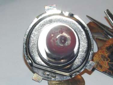 На следующих фотографиях показано, как располагается лампочка в фаре до ее поворота, и после отрезания усиков и установки в новое положение. Для наглядности, усики на цоколе лампочки закрашены красным маркером.