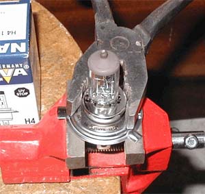 Дальше проще, зажимаем цоколь в тиски и аккуратно поворачиваем торцевой колпачок пассатижами градусов на 20. Тут хорошо бы прогреть пайку контактов паяльником чтобы ослабить напряжения натяжения выводов лампы, но можно и без этого.