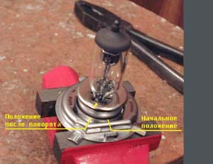 Поскольку лампочка фиксируется в фаре при помощи трех усиков, для ее поворота проще всего обыкновенными ножницами отрезать эти усики, после чего вставить лампочку в фару, повернув в противоположную сторону на аналогичный угол. За счет силы трения лампочка держится в фаре достаточно надежно, однако, если Вы все же опасаетесь, что в процессе эксплуатации она может повернуться, при отрезании усиков отрезайте их не полностью, а оставьте примерно 0,5 мм от каждого усика. Эти остатки, заостренные ножницами, очень хорошо вцепятся в пластиковый корпус фары и не дадут лампочке провернуться.