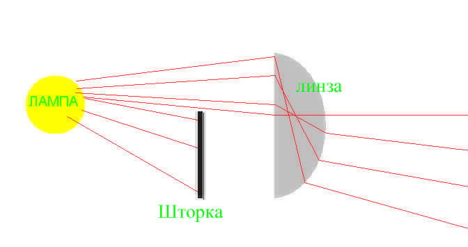 Линза, фокусируя свет, переворачивает его (с низу вверх, с лево на право). То есть, рисунок, образованный световым пучком, будет прямопротивоположный форме шторки.