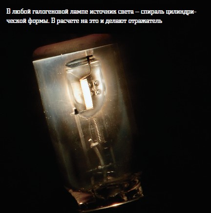В галогеновой лампе под спиралью ближнего света есть специальный экран, который и задаёт форму светового потока. Он отсекает верхнюю его часть. Поэтому на галогеновых лампах есть специальные установочные усики, которые позволяют установить лампу только строго определённым образом, когда световой экран будет находиться внизу. Это позволяет отсечь верхнюю часть светового потока, поэтому на ближнем свете появляется отчётливая граница света.