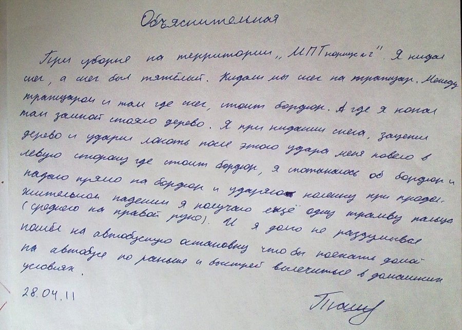 При уборке на территории "МПТ корпус №2". Я кидал снег, а снег был тяжёлый. Кидали мы снег на тротуар. Между тратуаром и там где снег, стоит бордюр. А где я копал там замной стояло дерево. Я при кидании снега, зацепил дерево и ударил локоть после этого удара меня повело в левую сторону где стоит бордюр, я спотыкаюсь об бордюр и падаю прямо на бордюр и ударяю коленку при продолжительном падении я получаю ещё одну травму пальца (среднего на правой руке). И я долго не раздумывая пошёл на автобусную остановку что бы поехать домой на автобусе по раньше и быстрей вылечится в домашних условиях.
