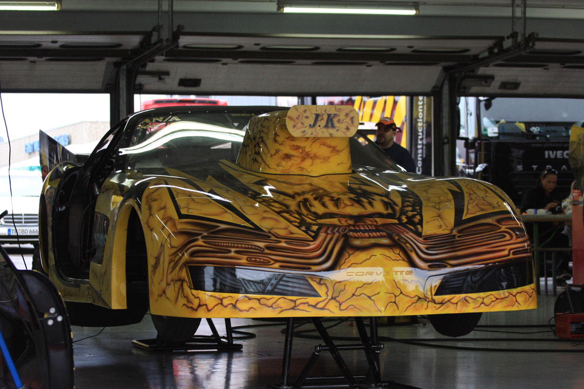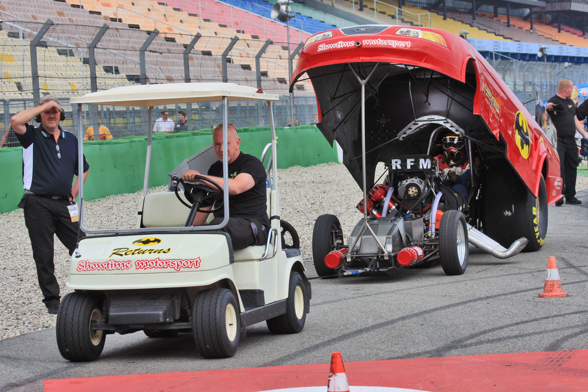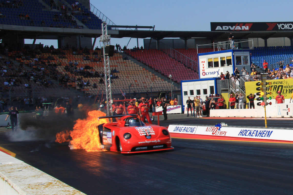 Вообще, обычно все проходит без эксцессов. Но тут в заездах Competition Cars произошло ЧП. Во время стартов что-то случилось с одним из автомобилей, построенным на базе Volkswagen New Beetle, гонщика Рональда Юттинга (Ronald Jutting). То ли от долгой раскрутки двигателя на старте перелилась закись, то ли просто двигатель не выдержал нагрузки, однако, автомобиль вспыхнул и загорелся. Огонь бил сзади из-под кузова и из-под колес и с каждой секундой разгорался все сильнее. Более того, пилот не мог сам вылезти из этого автомобиля: модифицированная форма кузова не позволяла ему это сделать. Хорошо, что работа служб безопасности построена по самому высокому классу: уже буквально через несколько секунд автомобиль потушили, а пилоту, целому и невредимому, помогли выбраться из раскаленных внутренностей.
